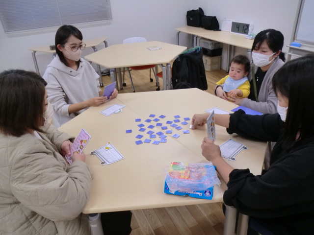 後半は、「子ども達の感じている楽しい気持ちをママ達も感じてみよう!」ということで、各グループに分かれて、もこもこ内にあるゲーム類から選りすぐりのゲーム達に挑戦して頂きました。